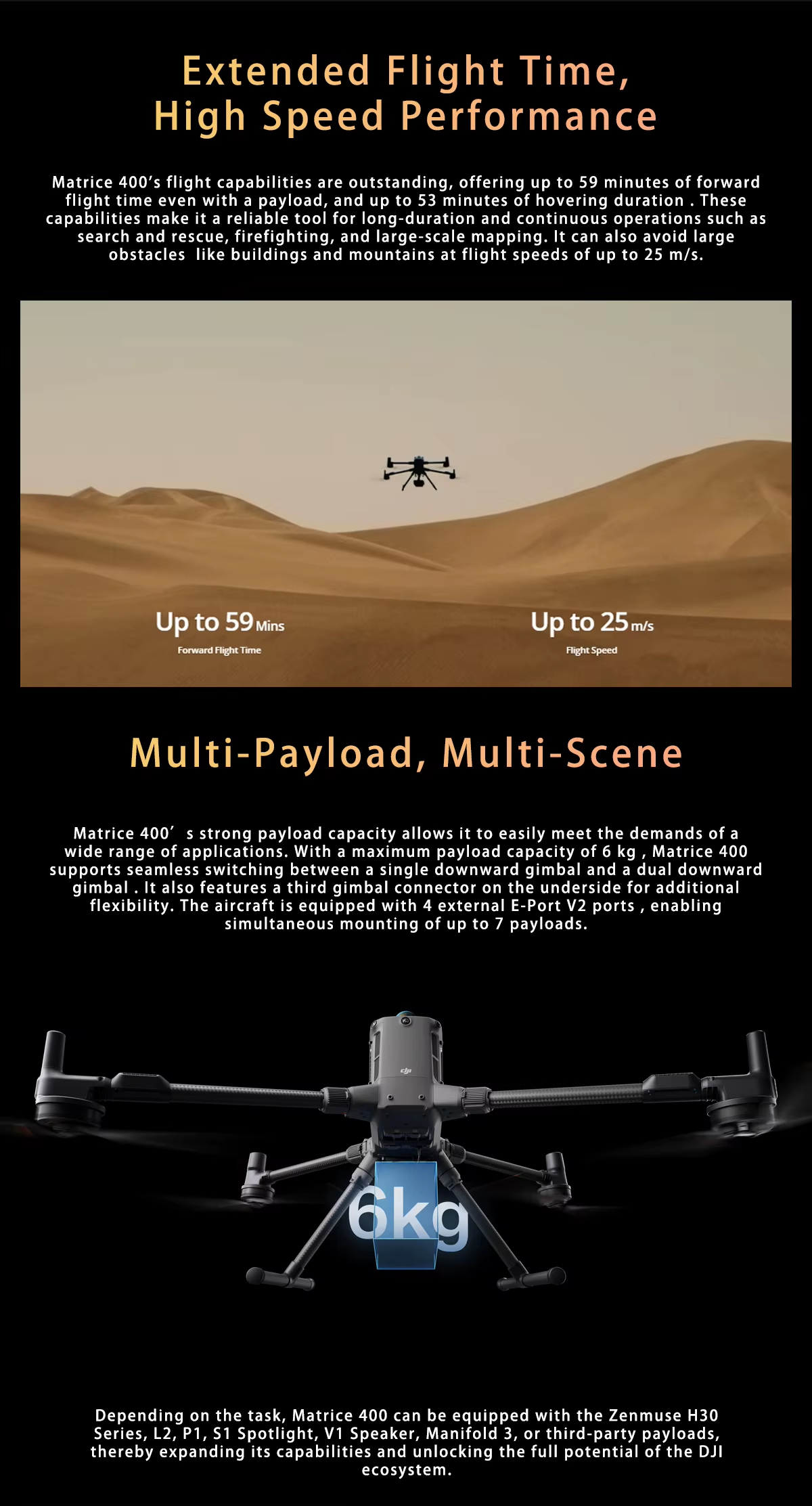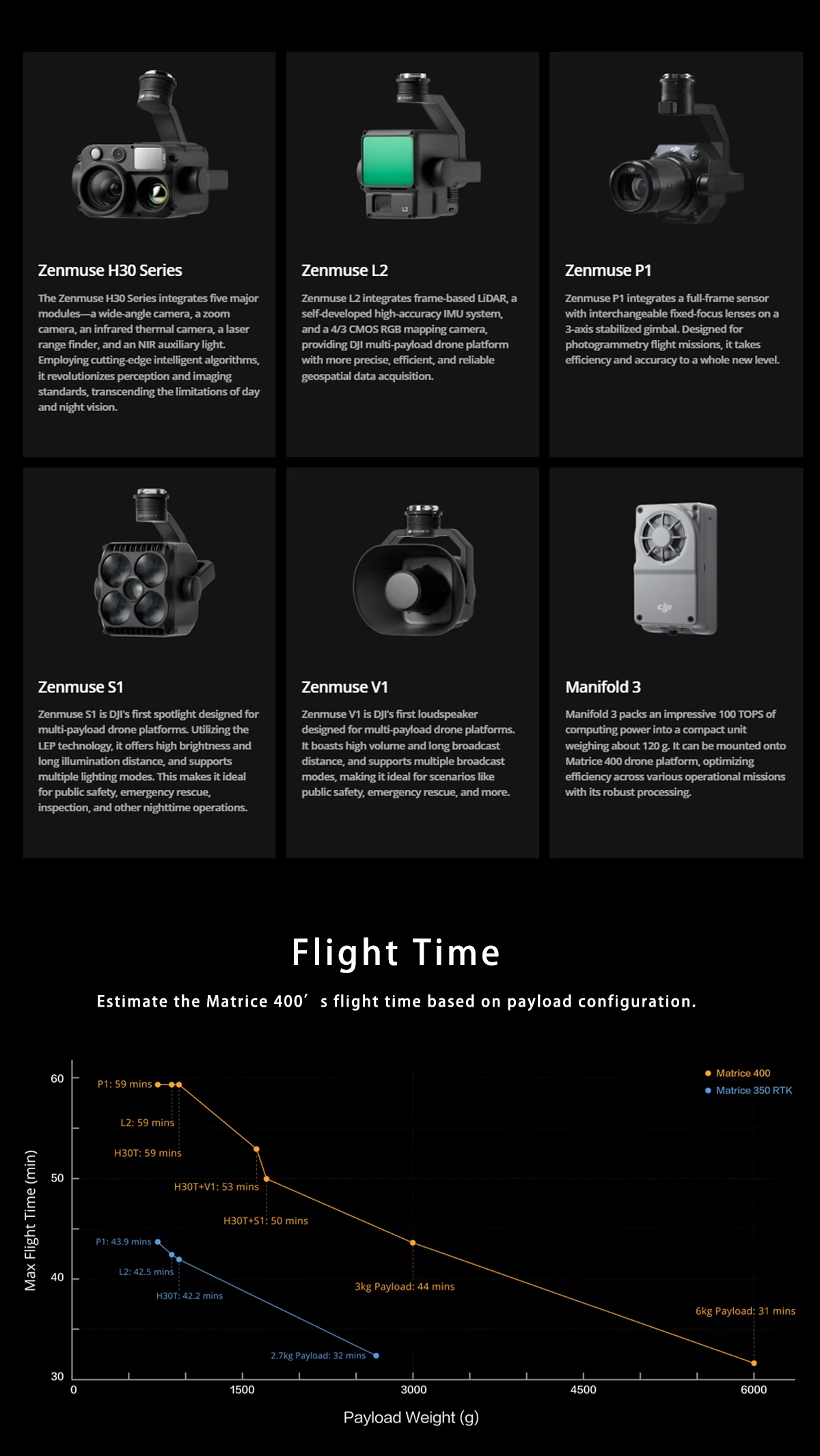 Brand:DJI Model number:DJI Matrice 400 Video capture resolution:4K UHD maximum flight time:59min maximum payload:6kg function:With Camera, App Control, Foldable Maximum effective signal distance:40 kilometers (FCC) 20 kilometers (CE/SRRC/MIC)