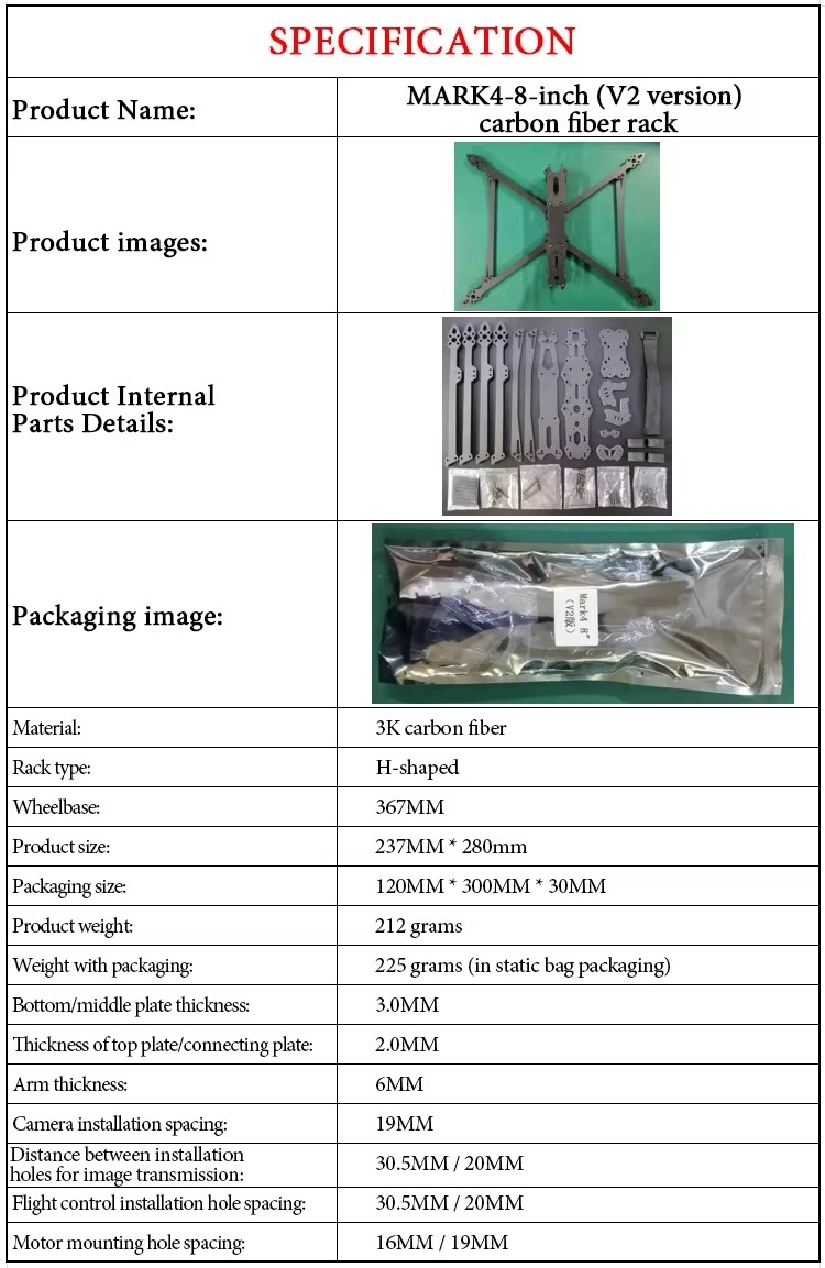 Color:Black Compatible brand: PFLY MARK4 V2 FPV Drone Frame KIT 9inch 387mm Material:Carbon Fiber Single gross weight: 0.2kg Single package size:12X8X5 cm place of origin:Guangdong, China Selling Units:Single item