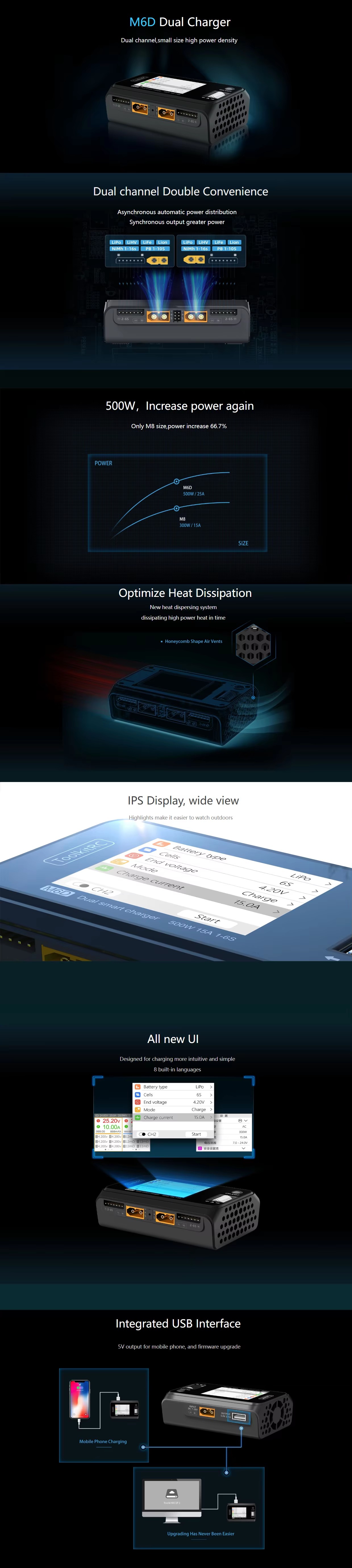 PFLY ToolkitRC M6D 500W 15A DC Dual Channel MINI Smart Charger Discharger Power Supply 1-6S FPV Drone Accessories