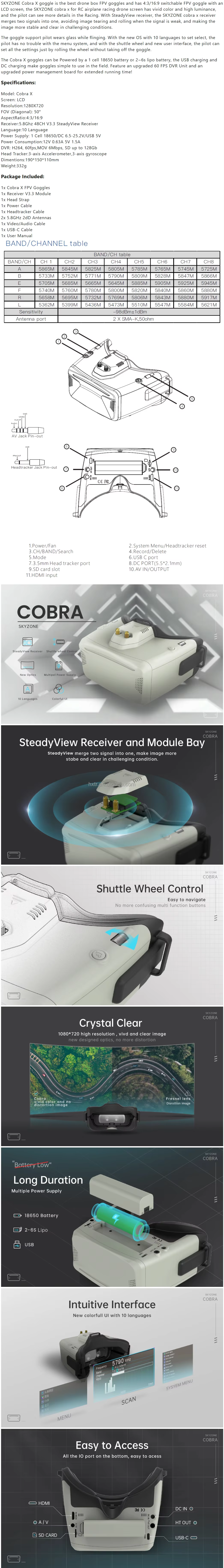 SKYZONE Cobra X V2/V4 Goggle Racing Drone Accessories 5.8g Frequency with 8g Weight for Camera Application Battery Power