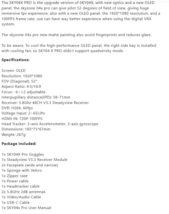 Color: Black Compatible model: For FPV Model number: SKYZONE SKY04X PRO Place of origin:Guangdong, China Selling Units:Single item Brand name:SKYZONE Single package size:25X15X10 cm