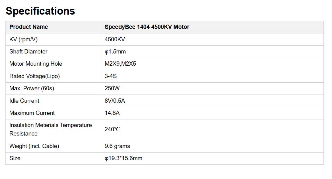 Color:Black Compatible brand: SpeedyBee 1404 4500KV Brushless Material:Metal Single gross weight: 0.500kg Single package size:12X8X5 cm cm place of origin:Guangdong, China Selling Units:Single item